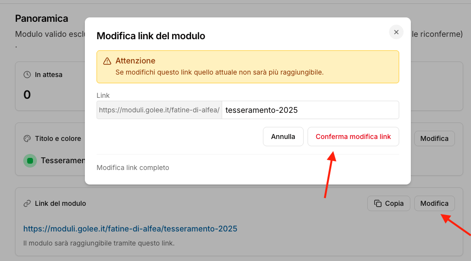 Attenzione: ogni modifica dei link di iscrizione, invalida quello precedente. Ricordati di condividere il nuovo link dopo aver effettuato la modifica.