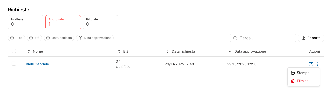 Di fianco ad una nuova richiesta di iscrizione puoi cliccare sui tre puntini a destra e poi sulla voce "stampa" per ottenere un resoconto cartaceo dei dati inseriti e dei consensi accettati.
