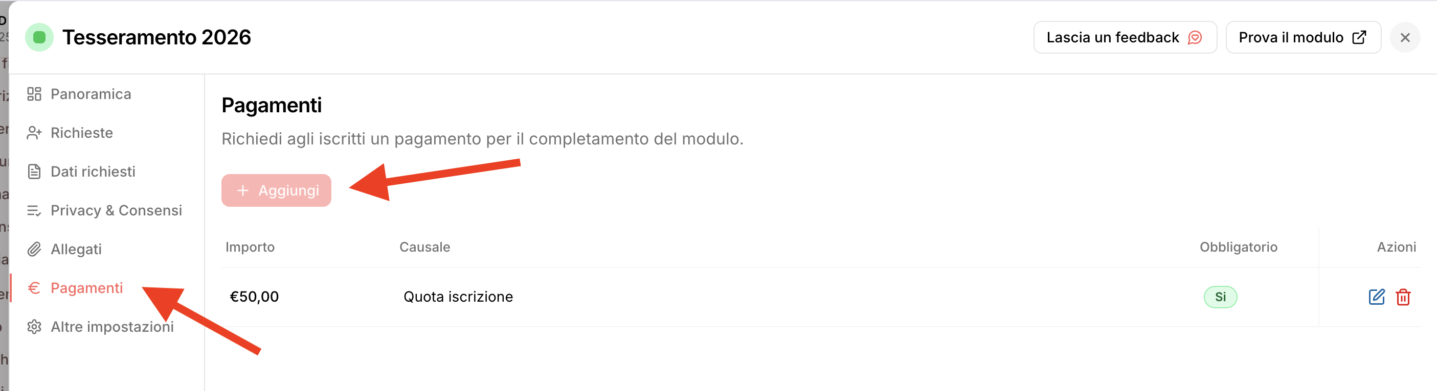 Se chi si iscrive o riconferma l'iscrizione deve anche pagare un acconto o la somma del corso, per farlo potrai aggiungere un pagamento obbligatorio o facoltativo dalla sezione "pagamenti".