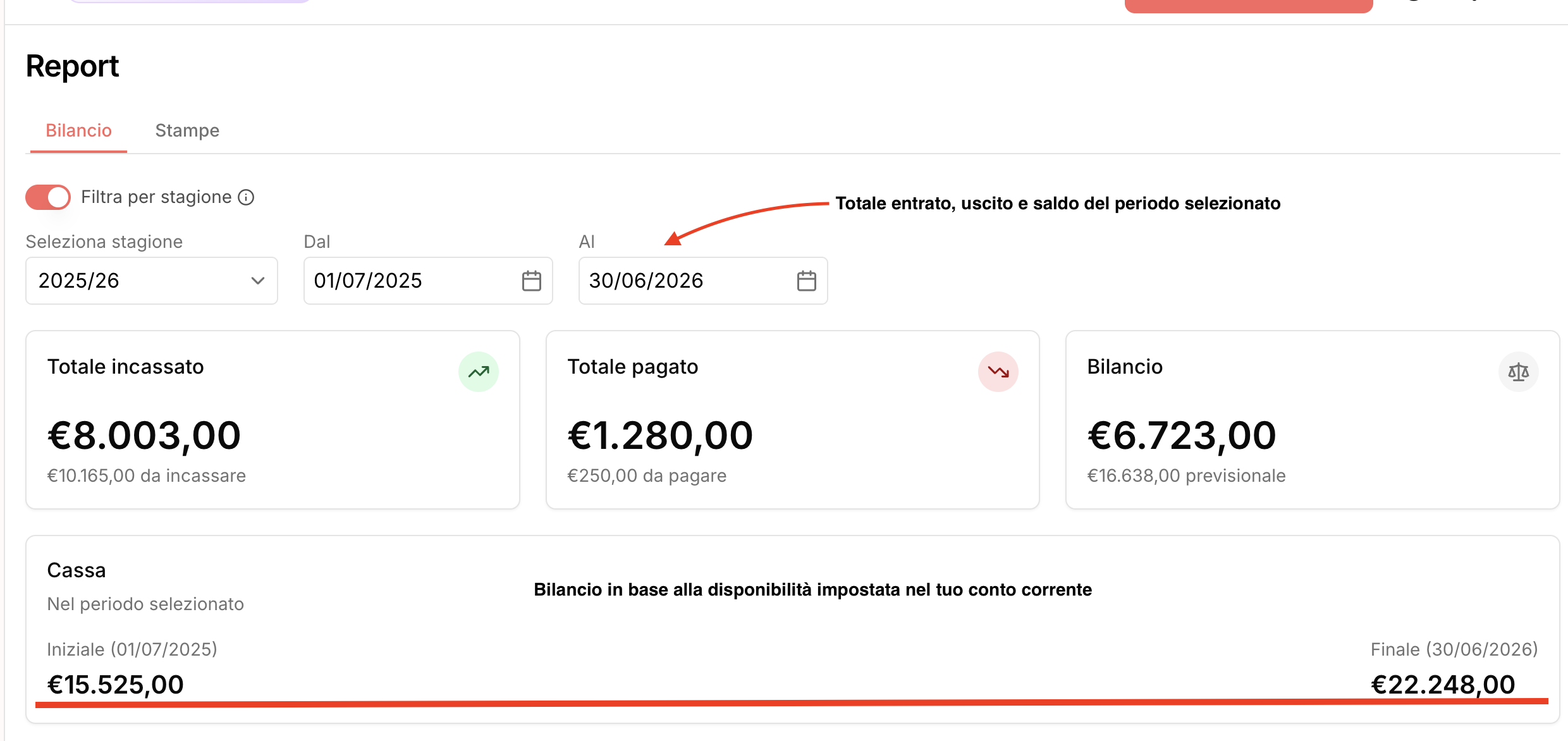 Il bilancio viene tarato in base al periodo selezionato in alto. Puoi scegliere la stagione, l'anno solare o impostare un periodo personalizzato. Di default è impostato sul mese corrente.