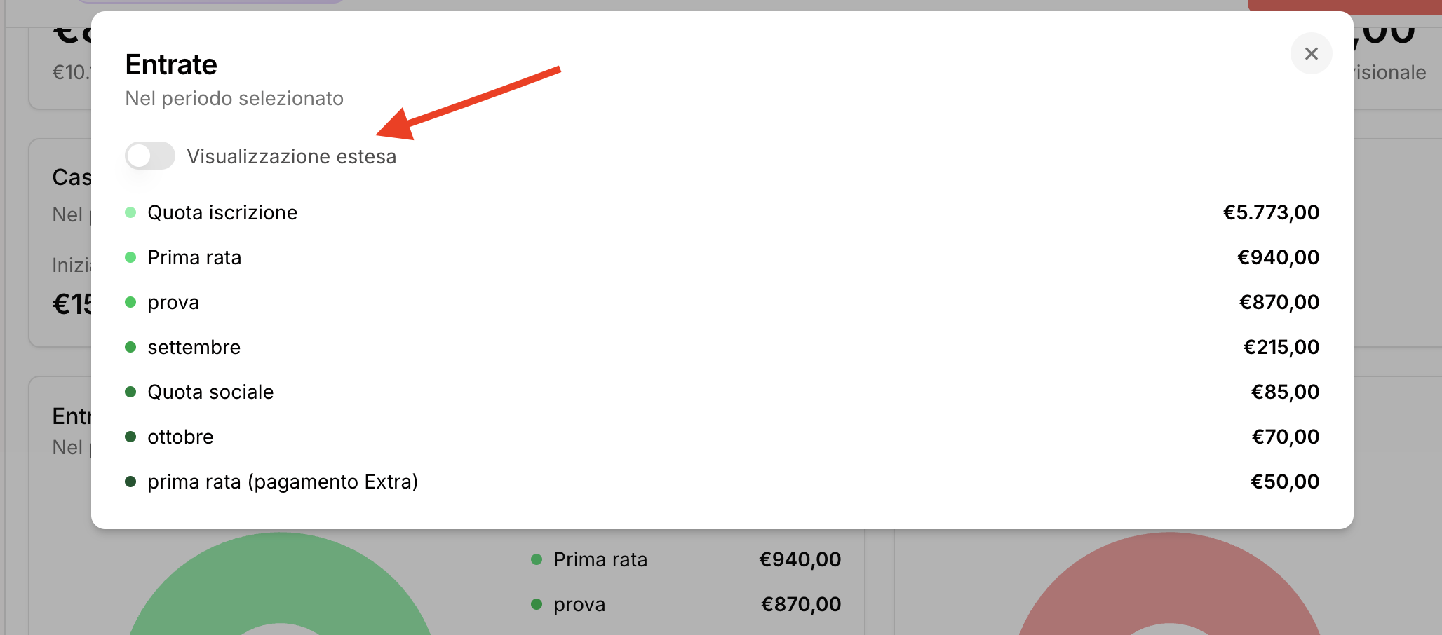 Scorrendo la sezione bilancio e andando nell'area Entrate/Uscite > Vedi Tutte, trovi un’altra distinzione che puoi fare: ottenere l'elenco delle entrate o uscite nel periodo per causale o per singola voce.