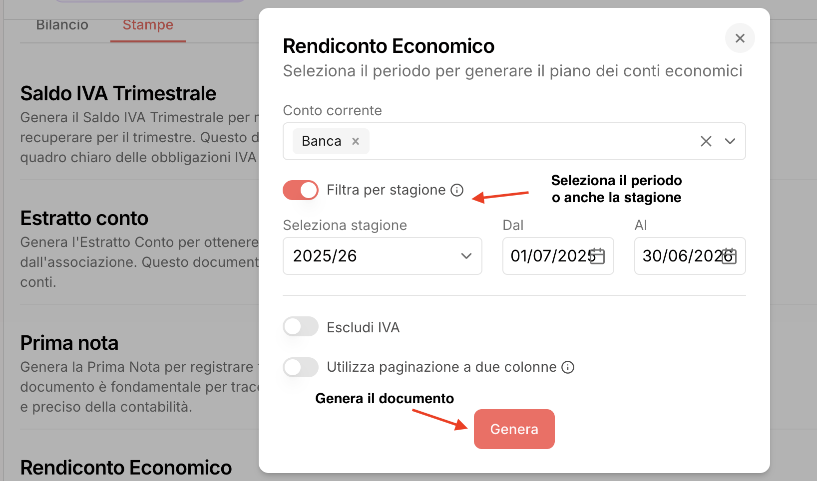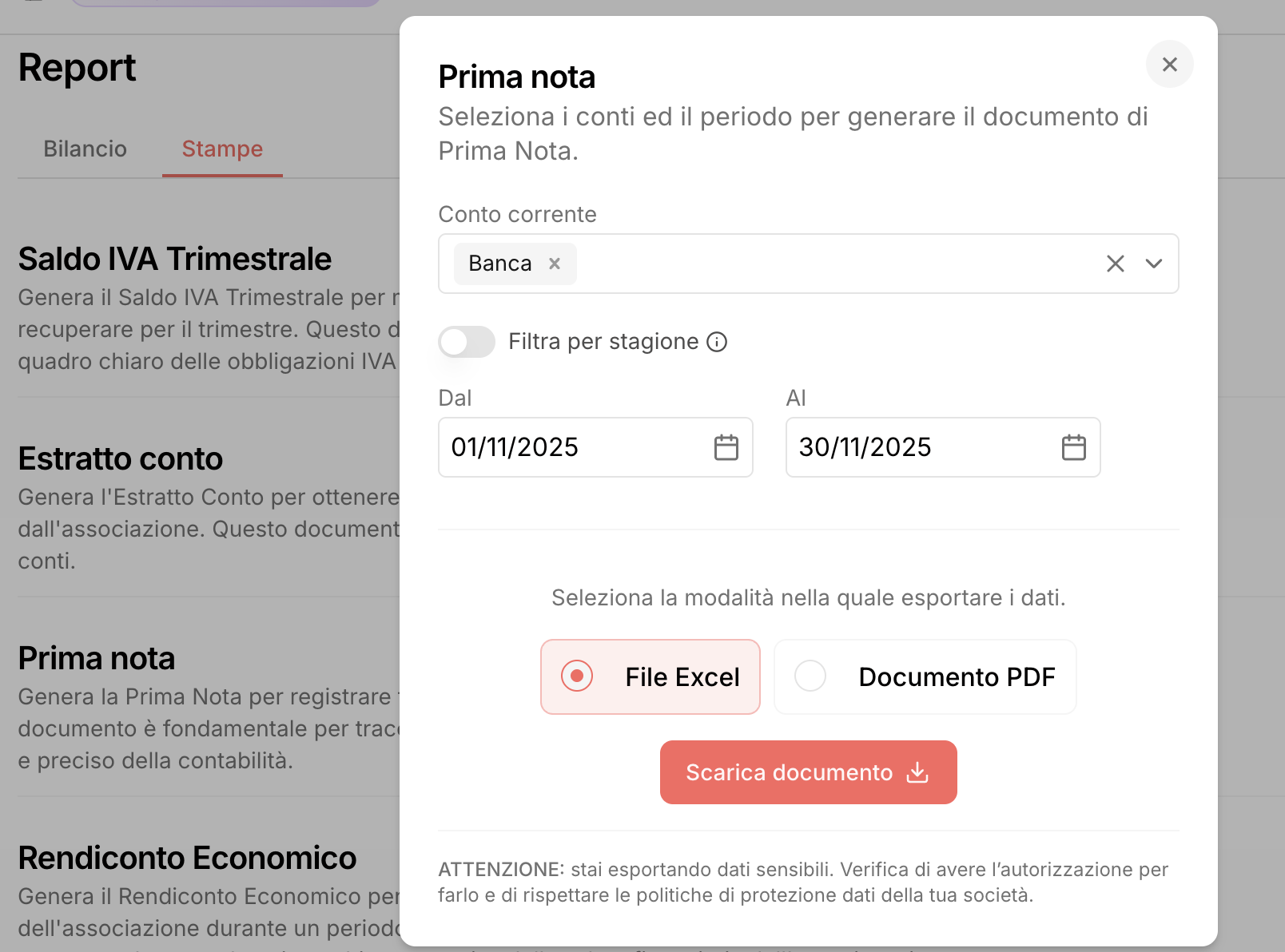 Ottieni prima nota, bilancio e altri report utili