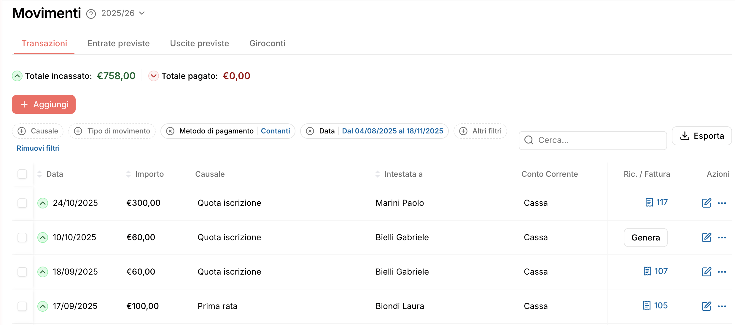Ad esempio, se volessi sapere tutte le entrate del mese di “quote iscrizione” effettuati con contanti, ti basterà aggregare i filtri di data, causale e periodo per avere l’elenco che ti serve: