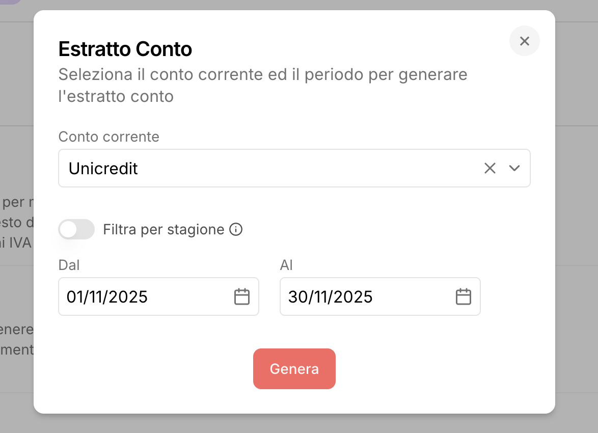 Nella sezione Report > Stampe puoi generare la stampa intitolata Estratto conto. Con questa otterrai, in PDF o in Excel, l'elenco di tutti i movimenti in entrata e in uscita del conto che selezioni, oltre che il saldo iniziale e finale del conto corrente.