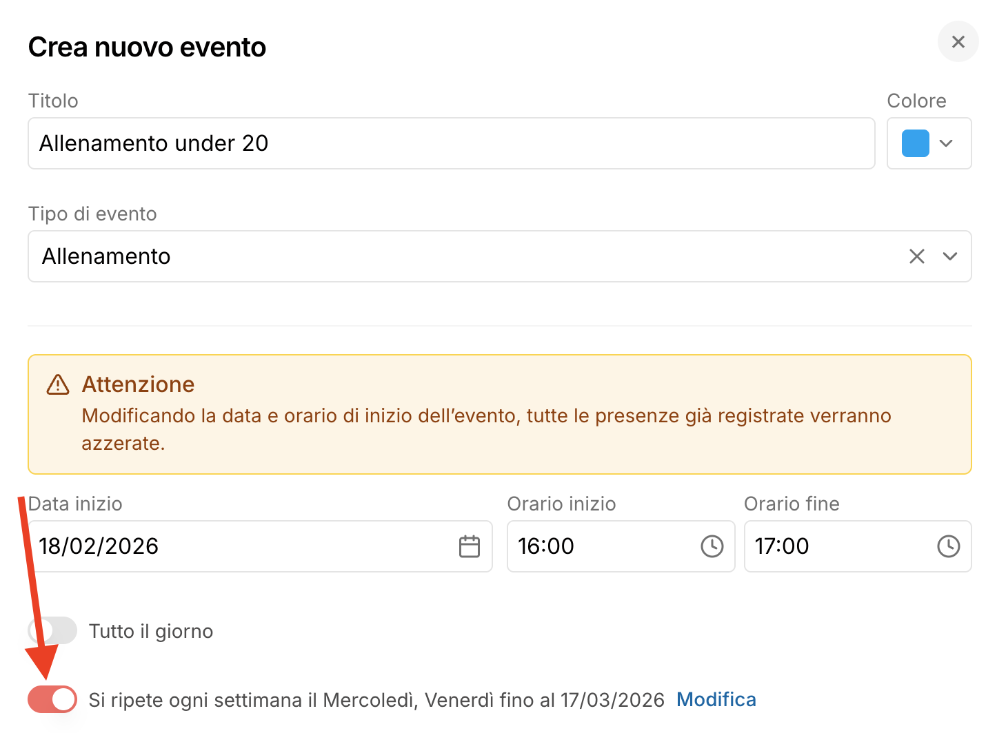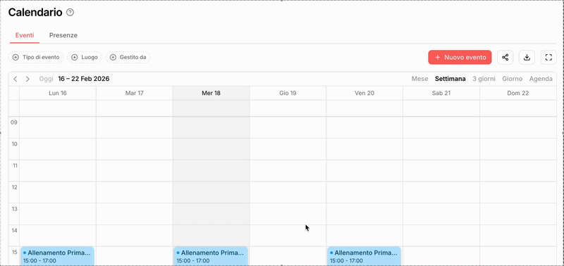 Quando crei un evento, puoi attivare l’opzione “Si ripete” e impostare giorni e orari. È utile per pianificare eventi ricorrenti, come allenamenti fissi (es. ogni giovedì dalle 15:00 alle 17:00).