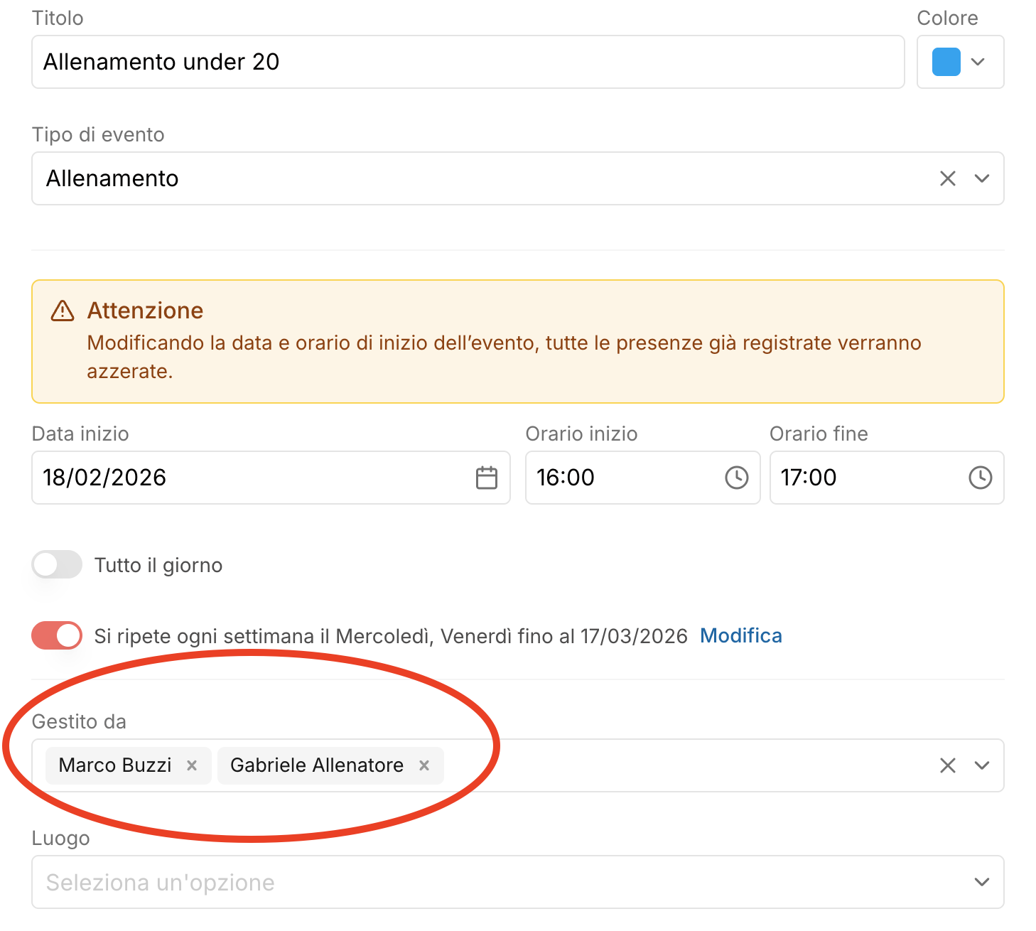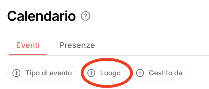 Ogni evento include il campo “Luogo”, che puoi impostare in fase di creazione o modifica. È un dato importante perché, nel calendario, puoi filtrare in alto per vedere solo gli eventi di un determinato luogo. Questa funzione è ideale per società o associazioni con più sedi.