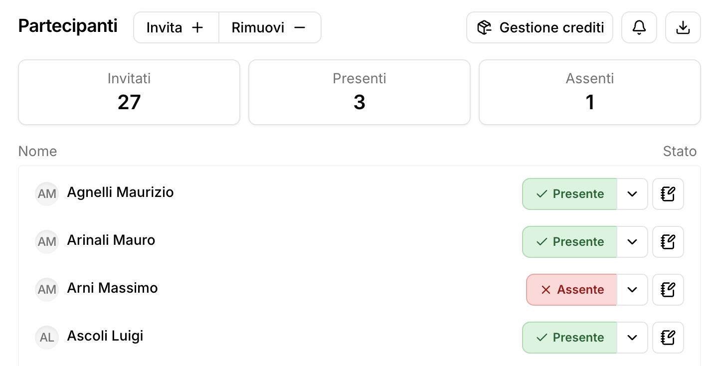 Dopo aver creato un evento (singolo o ricorrente), puoi usare la funzione “Invita” per associare all’evento le persone che devono partecipare. Una volta concluso l’evento, potrai registrare le presenze e ottenere report statistici durante la stagione.