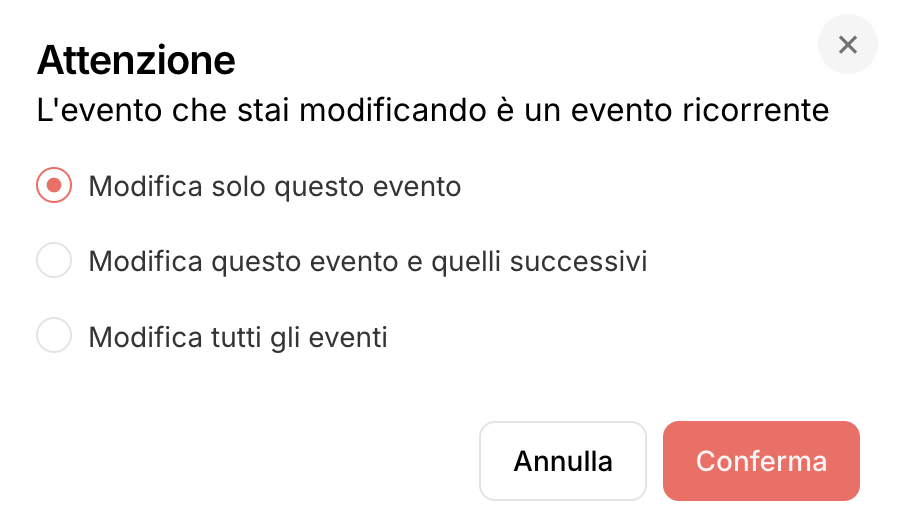 Se in futuro modifichi uno di questi eventi, puoi scegliere se aggiornare tutta la serie, solo l’evento selezionato oppure solo quelli futuri.