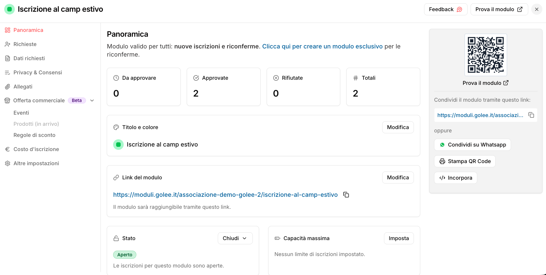 Il modulo di iscrizione, che puoi utilizzare per raccogliere conferme o nuovi iscritti tra un anno e l'altro, può essere utilizzato anche per ottenere adesioni ad attività extra come camp estivi, open day o altri eventi.