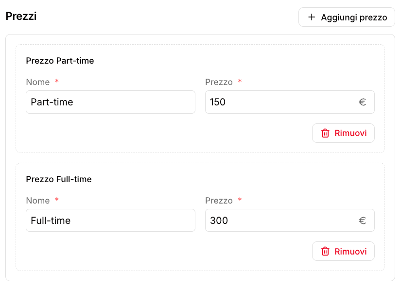 - se vuoi aggiungerne altre clicca su Aggiungi prezzo