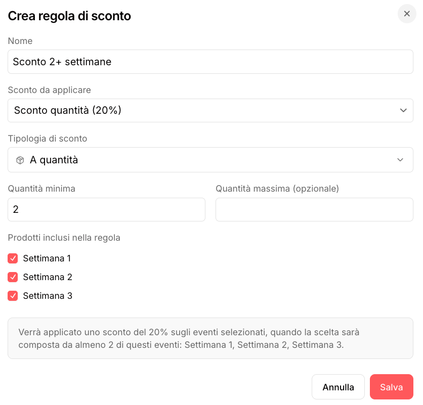- Quantità minima e massima a cui applicarlo (esempio: se la quantità minima scelta è 2, a partire dalla seconda settimana viene applicato lo sconto per quella e le successive)