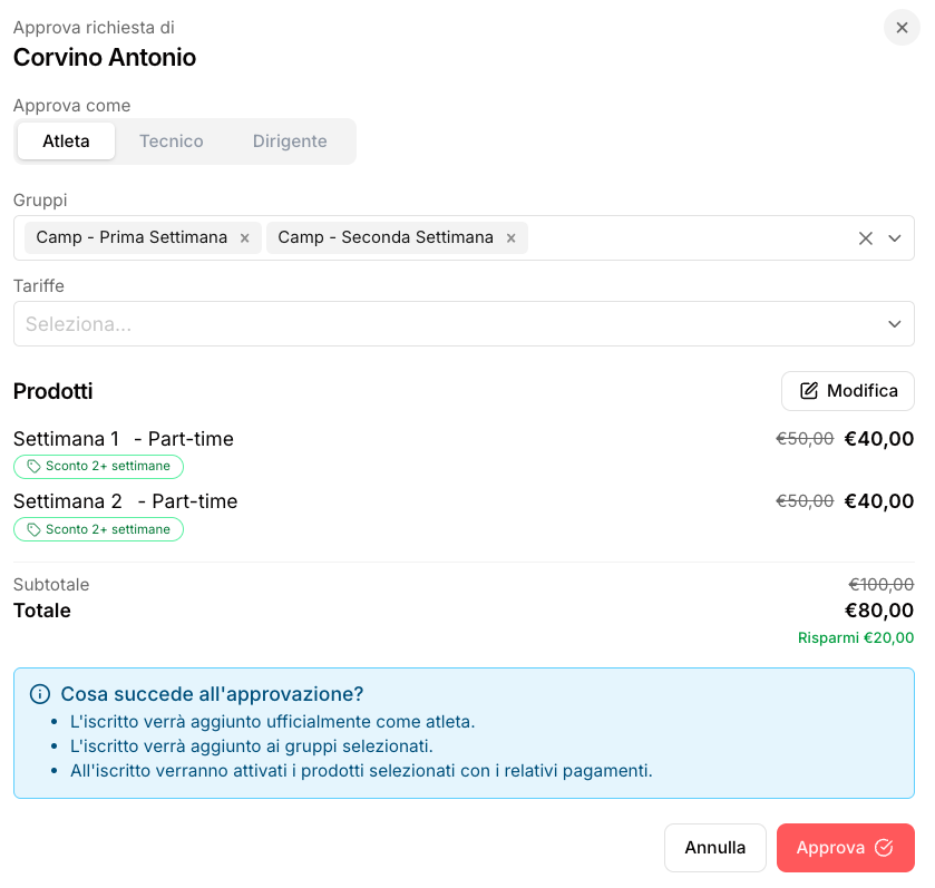 Anche in questo caso puoi inviare una notifica di approvazione e attivare l'account in app al tesserato.