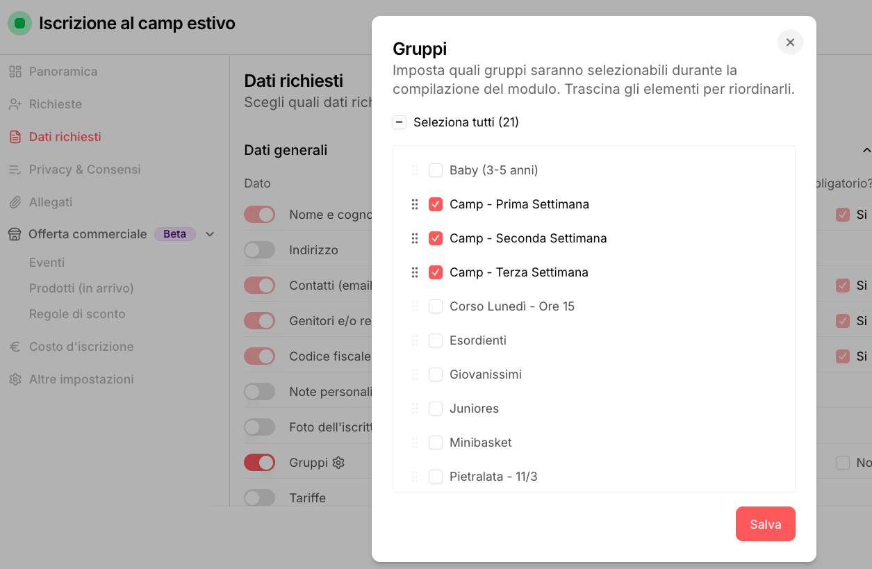 Il primo suggerimento è di creare, dalla sezione Gruppi, uno per ogni settimana del camp e dalla sezione Dati richiesti del modulo, richiedere il campo in maniera obbligatorio. Clicca sulla rondella di fianco a gruppi per scegliere quali selezionare.